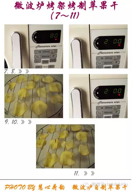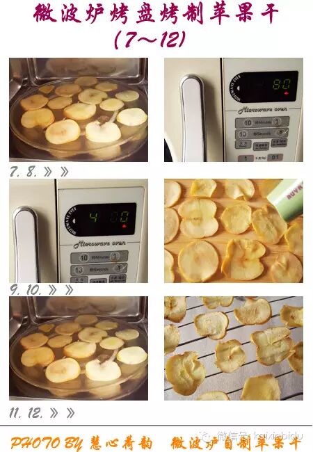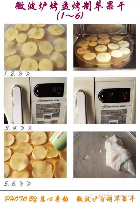 11、用干净百洁布擦干烤盘水分,苹果片重新分散排放在烤盘上,放入微波炉中。中高火火力80加热2~4分钟。