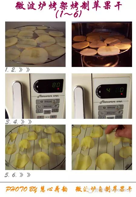 4、烤架烤制过程,苹果片第二次放入微波炉时要注意火力的控制,防止苹果片与微波炉顶部接触太近表面烤焦。